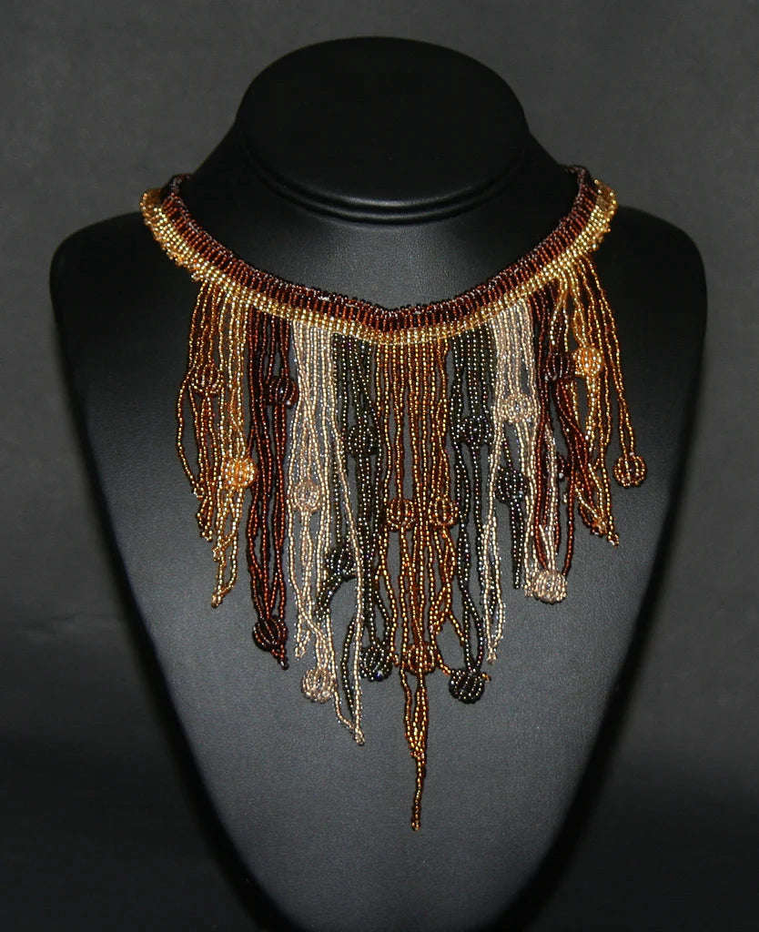African Choker Beaded Cascade Necklace Brown Gold Copper Gray