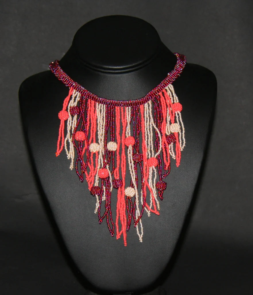 African Choker Beaded Cascade Necklace Burgundy Orange White