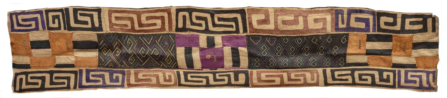 This Kuba-made raffia textile features a combination of two techniques: appliqué and tie-dye, making it a unique wall hanging. The borders are tie-dyed and the center strips have a vibrant Matisse-style pattern.